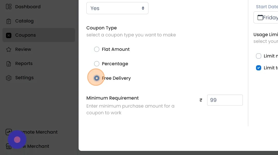 There are three types of coupon types: Flat Amount, Percentage, and Free Delivery.