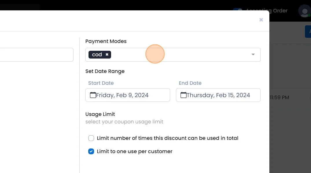 Payment Modes: Select whether the coupon will be applied based on the Payment method.