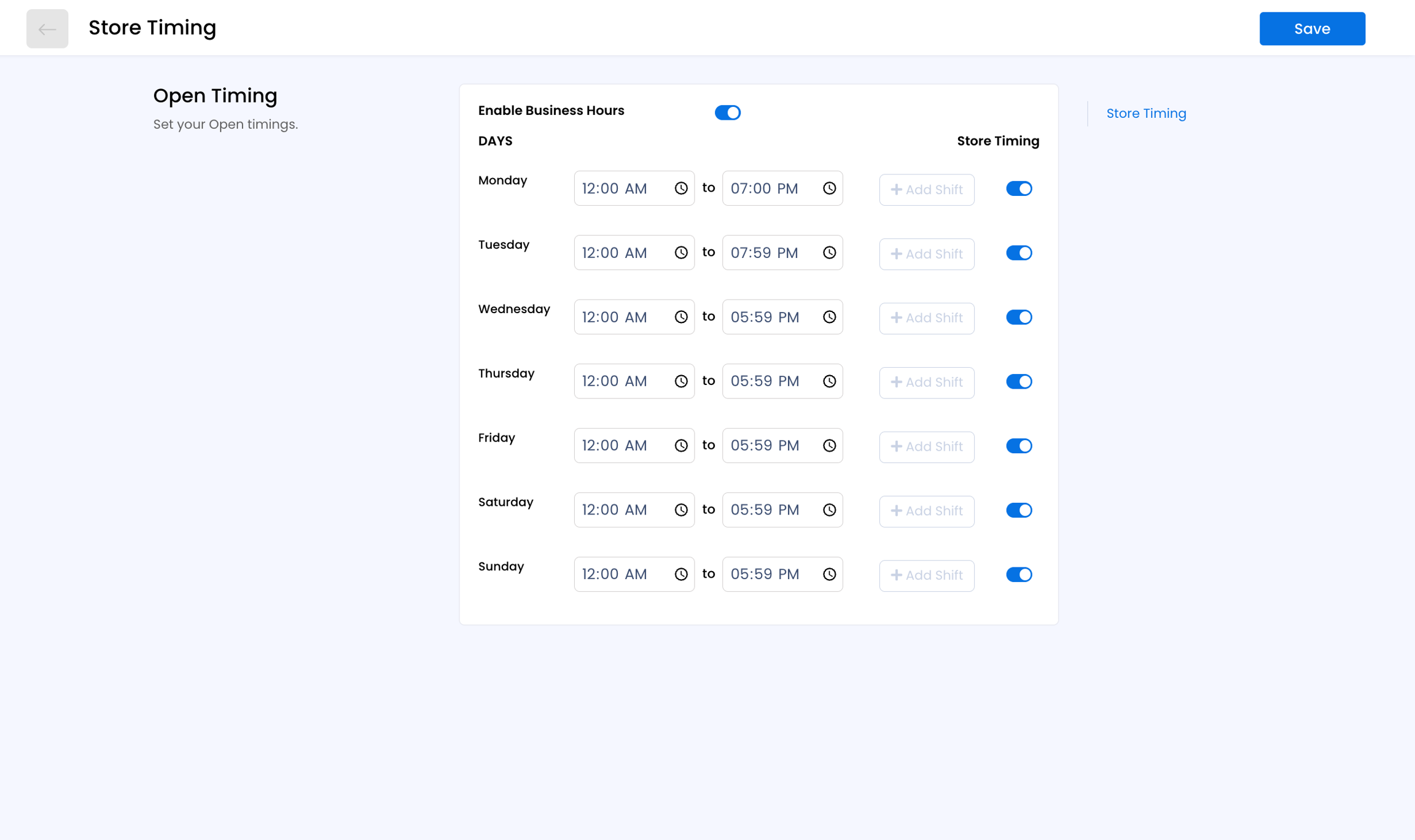 Note: It's mandatory to enable and configure your business hours if you offer order scheduling options to customers.