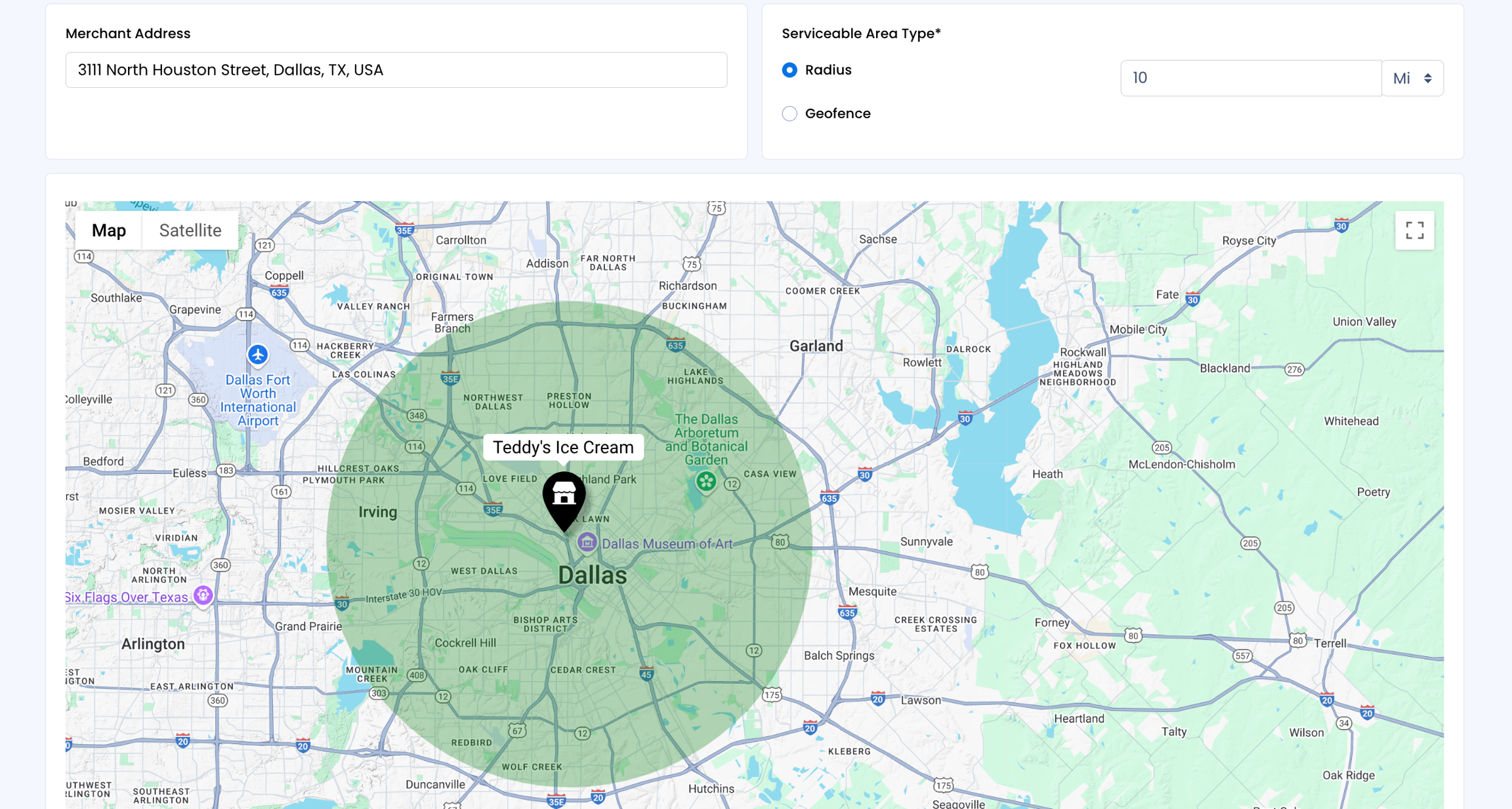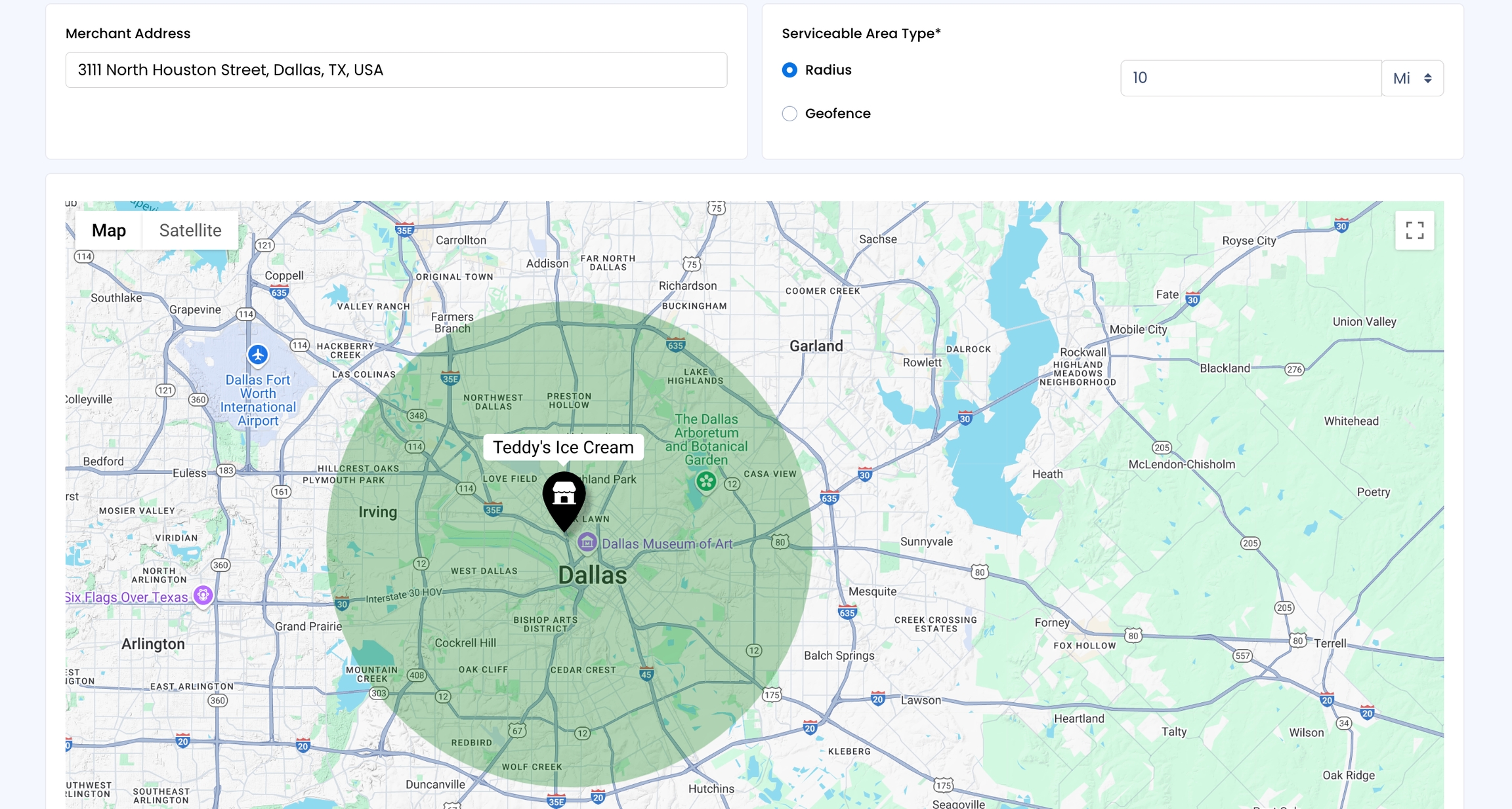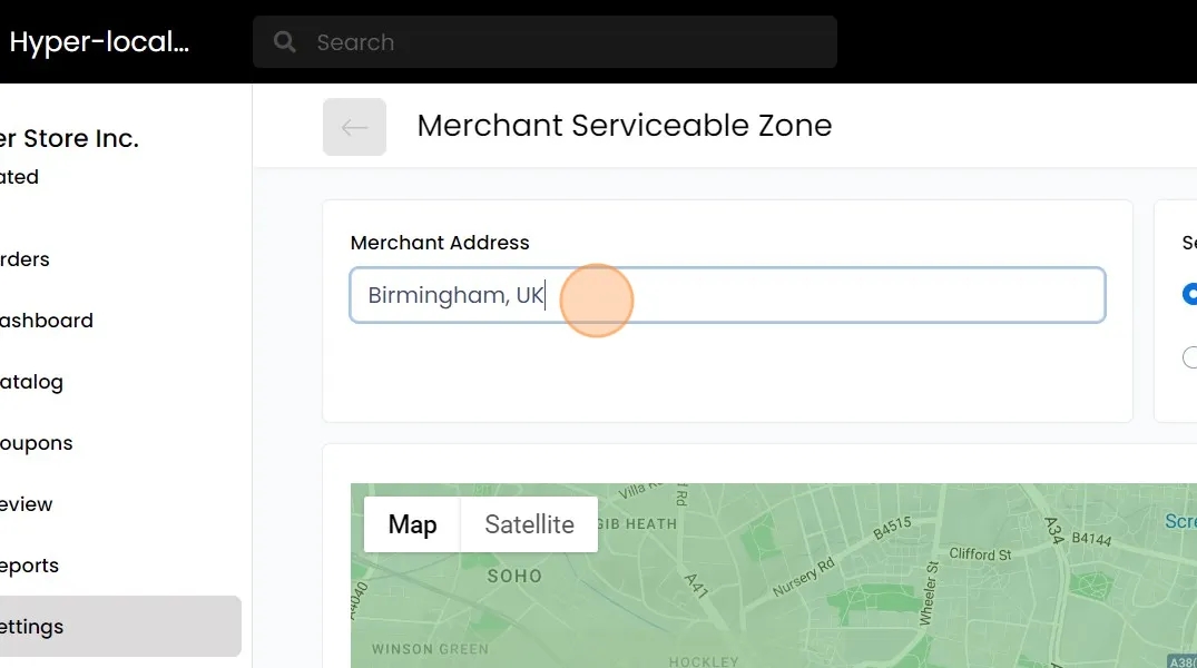 Radius: SSNATCH automatically sets the distance to 10 or 15 miles based on the delivery partners set for your store. A raidus circle is drawn from your marker point.